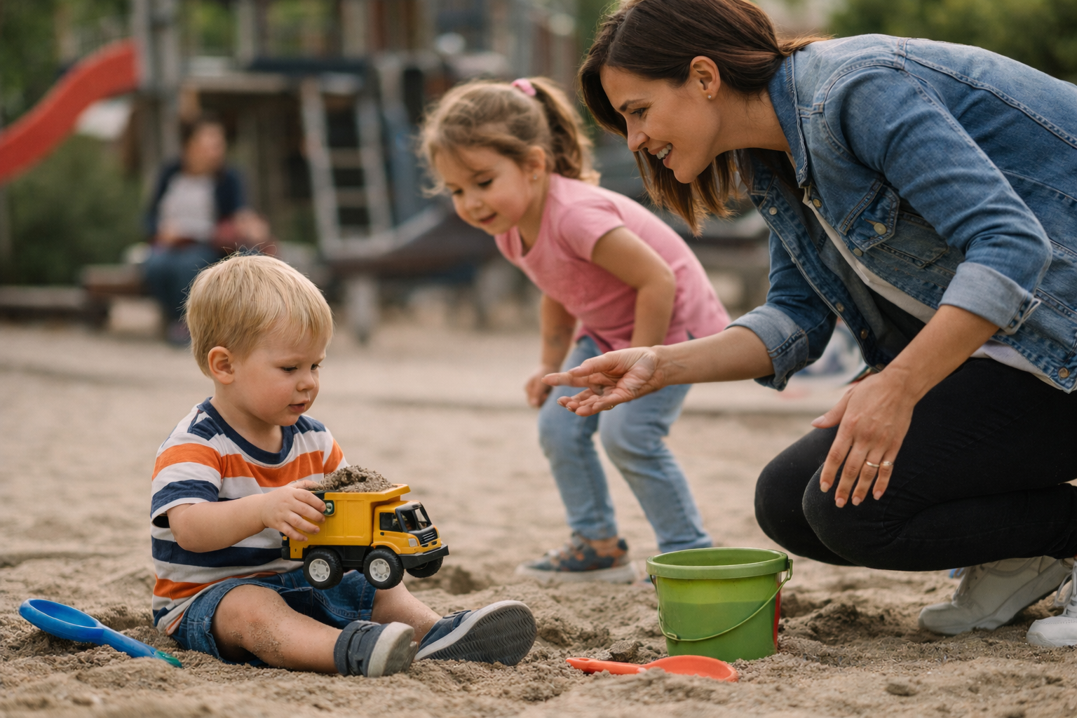A toddler finds something interesting — a truck, a shovel, a bucket.